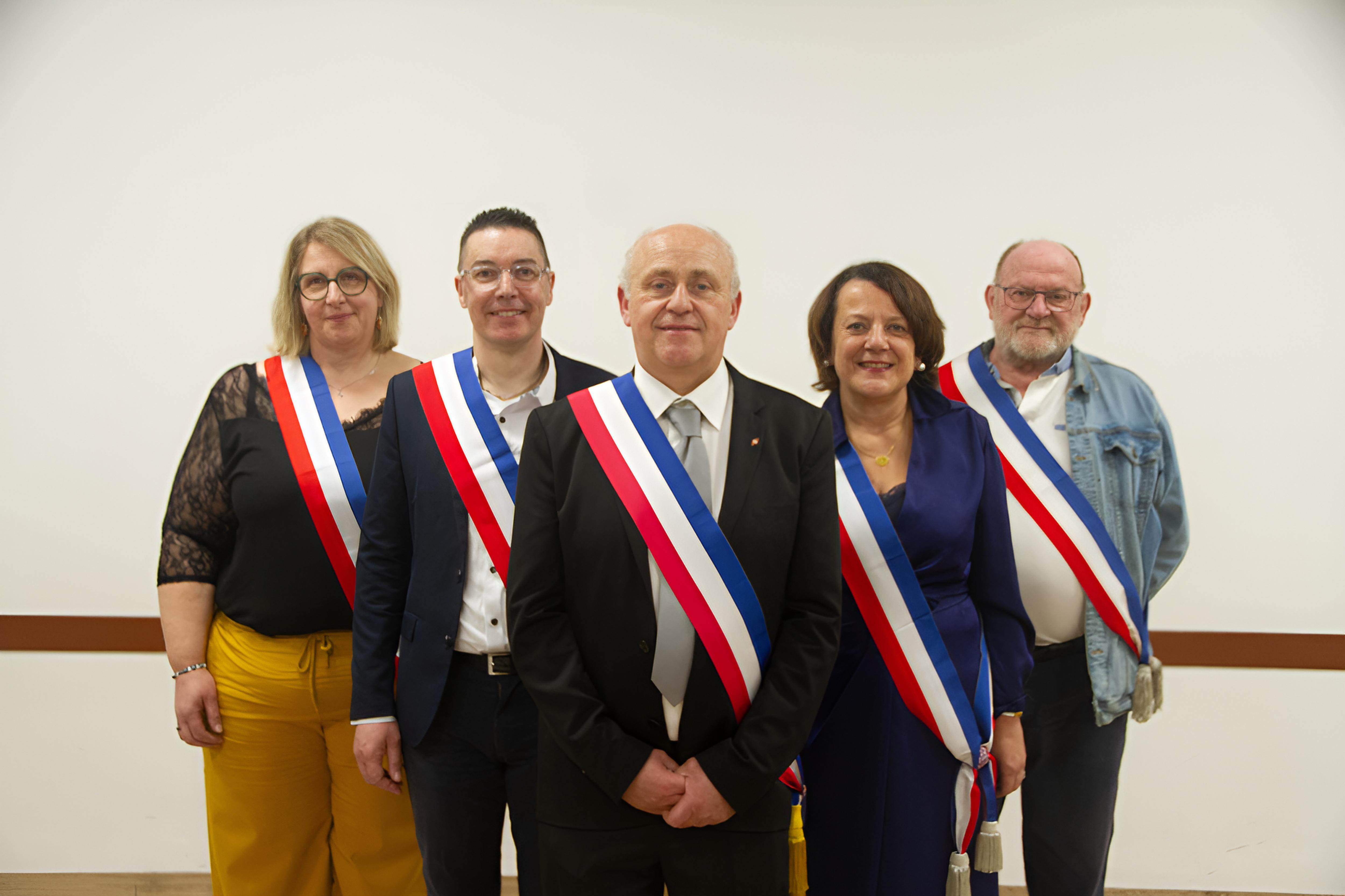 Thierry DEHONDT-BEDAGUE (Maire), Nathalie BALZA (1ère adjointe), Alexandre DECODTS (2ème adjoint), Ludivine PLANCKEEL(3ème adjointe), Bernard VERHAEGHE (4ème adjoint)